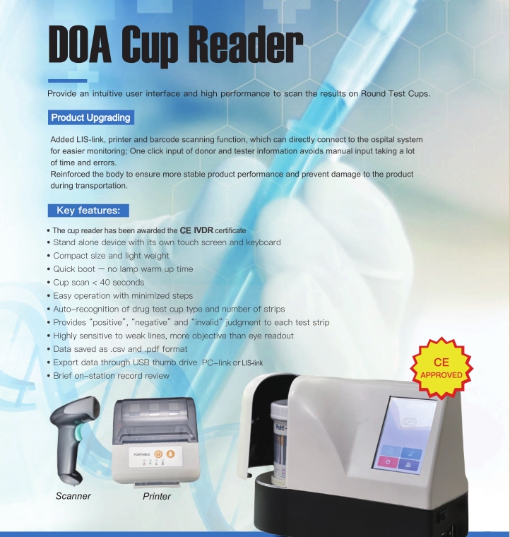 DOA Reader features an intuitive user interface and powerful processing capabilities. It automatically recognizes which cup has been inserted and how many Drug of Abuse (DOA) screening strips it has, and will complete scanning within 1 minute. With DOA Reader, each test will be analyzed by equipment more sensitive than the human eye, and the unbiased results can be reproduced.... all more quickly than a technician can record so many results!